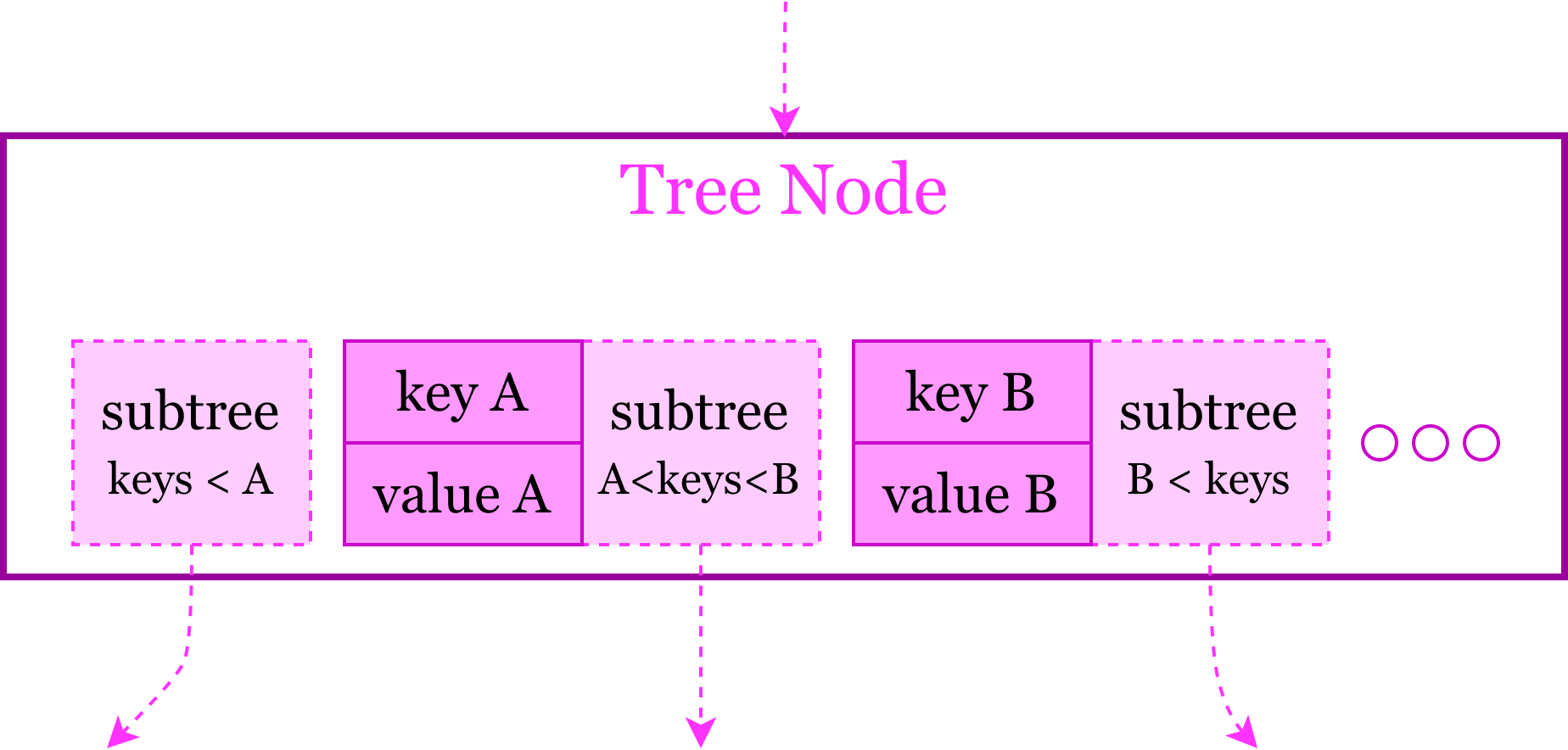 Nodes connect together to form the tree. An Entry ("TreeEntry") is one key/value pair inside a node. Keys are lexicographically sorted from left to right within entries, and in fact are globally sorted across the entire tree.