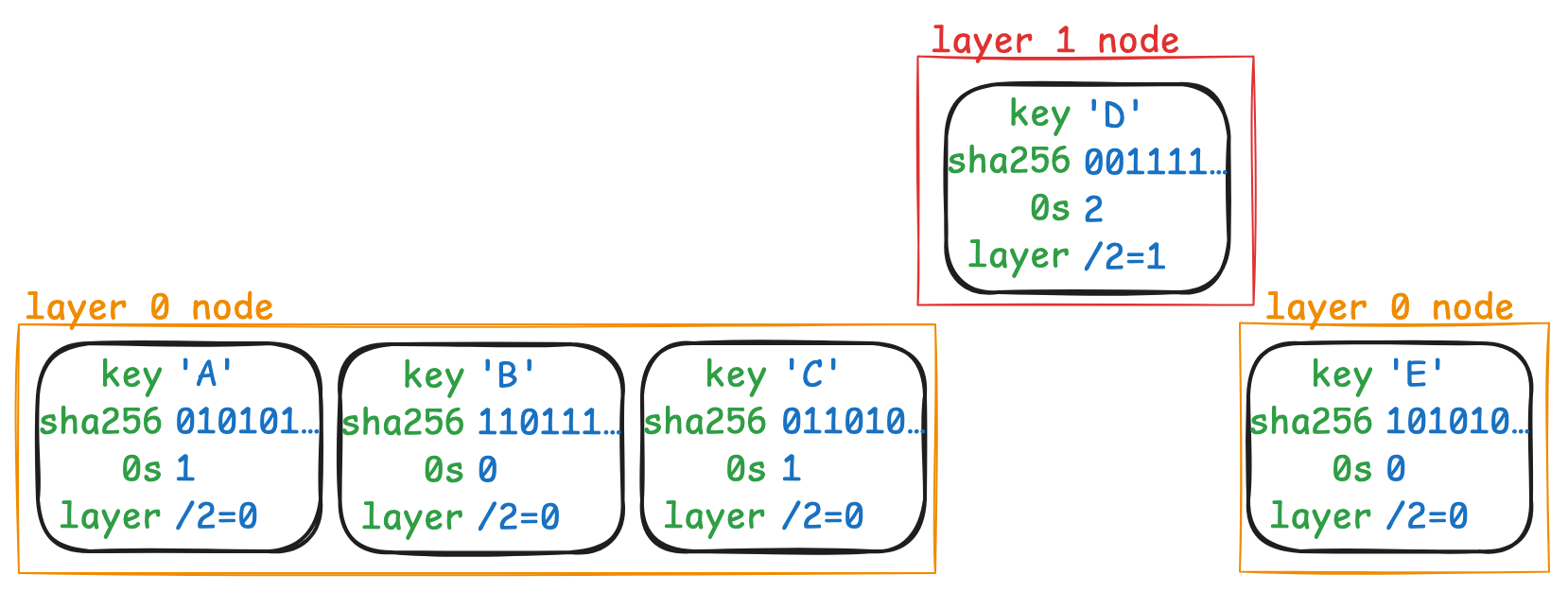 To raise the entries from just a sorted list into an actual tree, some keys are assigned a layer > 0, which you can find:layer =leading_zeros(sha256(key)) / 2