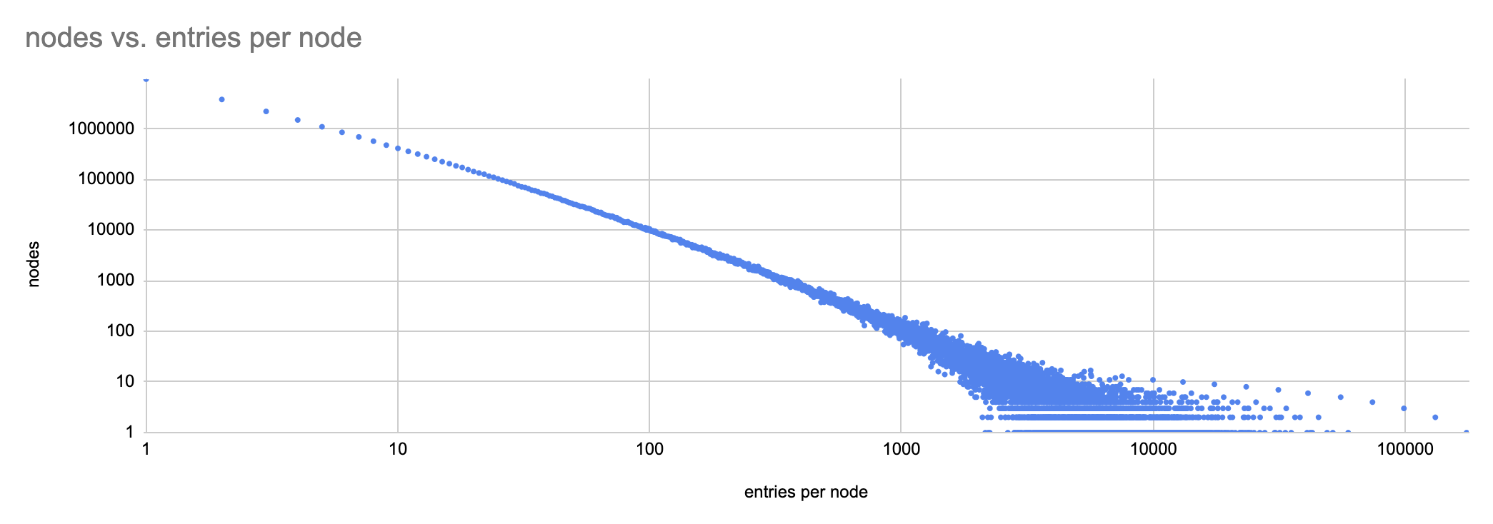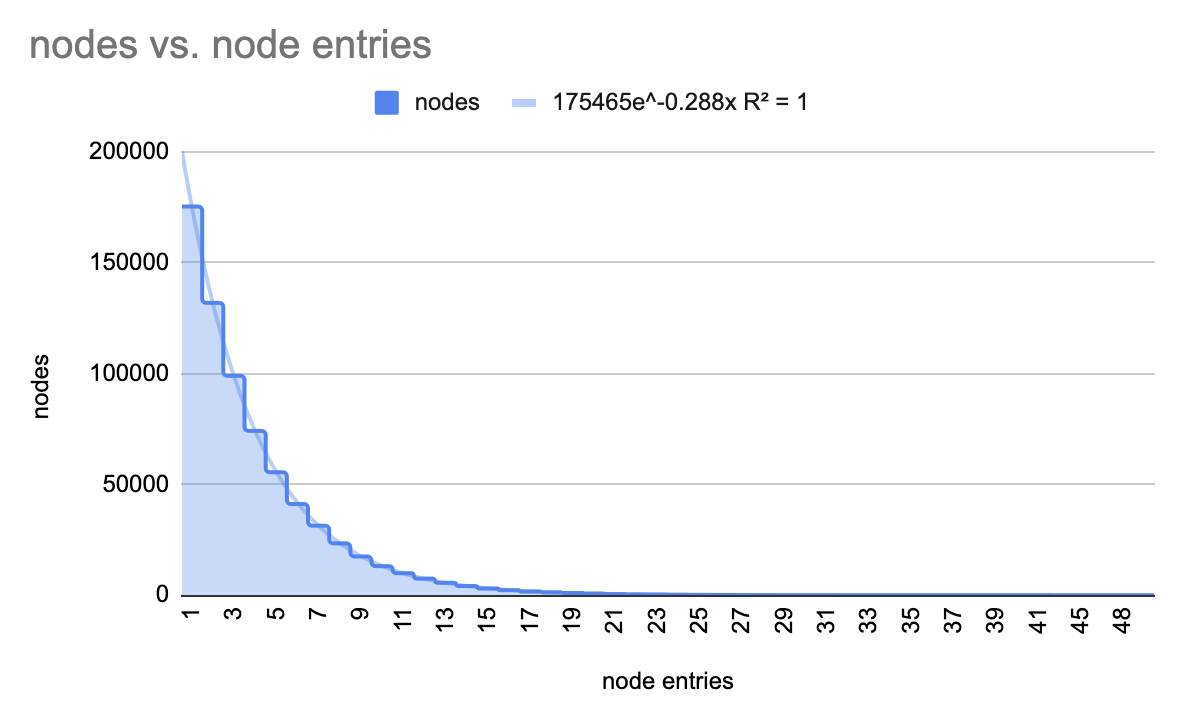 The exponential fit is very close to our earlier single-repo sample, with a hair higher decay rate (the e^-2.89x). Average nodes per entry is slightly lower, 3.986 (💅 did i say low-count bias earlier?)