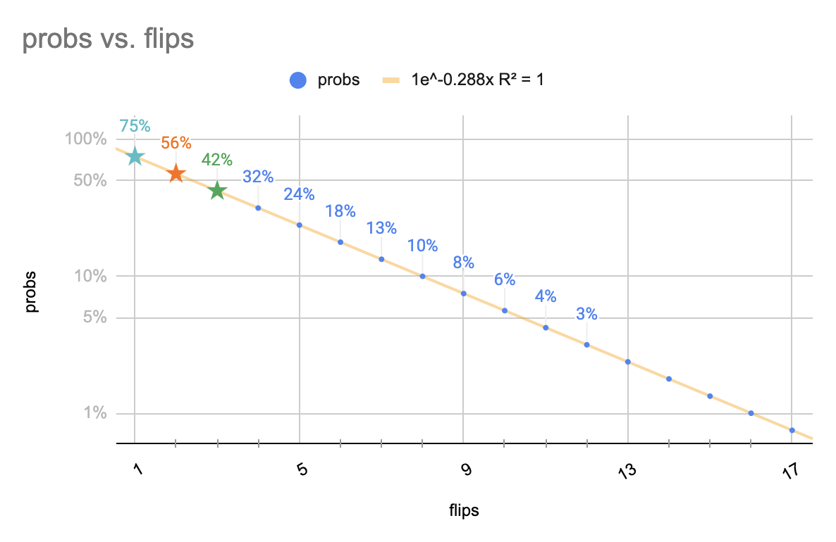 Time to unthinkingly spew numbers onto a sheet. Your chance of winning at least the first flip was 75%; making it to two-in-a-row 75% × 75% = 56.25%; three: 75% × 75% × 75% = 42%ish, etc.